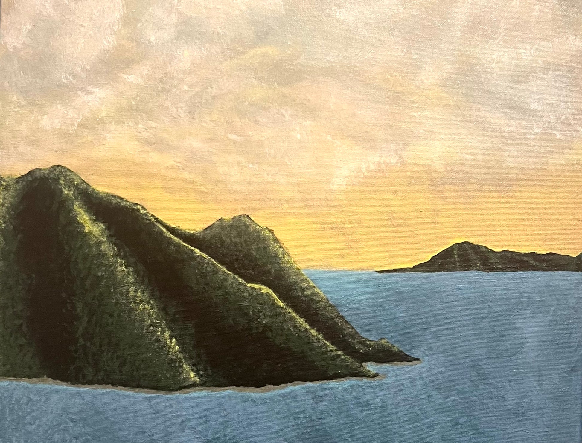 "Silent Shores" features lush islands rising gracefully from the calm, deep blue sea, their gentle contours framed by a sky suffused with golds and beige.